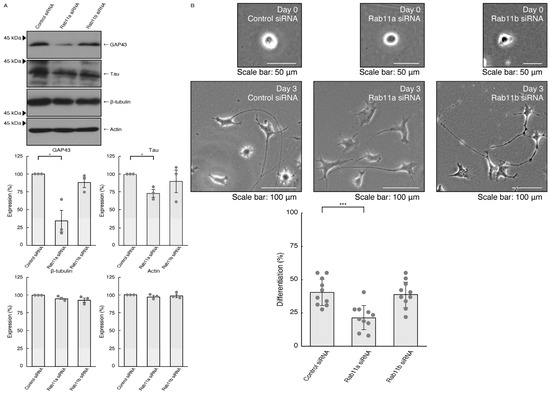 Knockdown of Rab11a and Rab11b affects neuronal cell morphological differentiation. (A) N1E-115 cells were transfected with control (luciferase), Rab11a, or Rab11b siRNA, allowed to differentiate for 3 days, and immunoblotted using the respective antibodies for neuronal differentiation markers (GAP43 and Tau) and internal control proteins (tubulin and actin). The respective statistical analyses with control values as 100% for scanned immunoreactive bands were depicted in the graph (* p < 0.05; n = 3 blots). (B) Following the induction of differentiation, the respective cell morphologies at 0 and 3 days were placed as the representative images, analyzed, and statistically depicted (*** p < 0.001; n = 10 fields). Cells with processes three times the lengths of the cell body were considered differentiated ones.