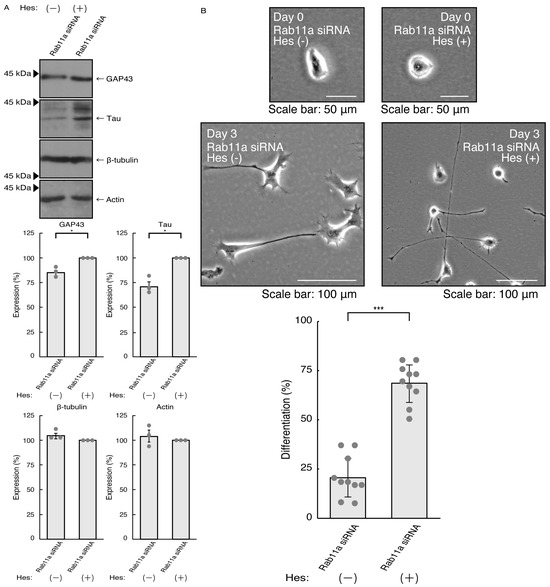 Hesperetin recovers knocking down the effects of Rab11a. (A) N1E-115 cells were transfected with Rab11a siRNA, treated with 15 micromolar concentration of hesperetin (Hes [+]) or its vehicle control (Hes [−]), allowed to differentiate for 3 days, and immunoblotted with the respective antibodies for neuronal differentiation markers (GAP43 and Tau) and internal control proteins (tubulin and actin). The respective statistical analyses are depicted in the graph (* p < 0.05; n = 3 blots). (B) Following the induction of differentiation, the respective cell morphologies at 0 and 3 days are placed as the representative images, analyzed, and statistically depicted (*** p < 0.001; n = 10 fields).