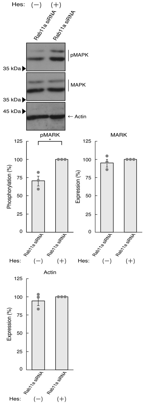 Hesperetin recovers MAPK phosphorylation decreased by knocking down Rab11a. N1E-115 cells were transfected with Rab11a siRNA, treated with 15 micromolar concentration of hesperetin (Hes [+]) or its vehicle control (Hes [−]), allowed to differentiate for 3 days, and immunoblotted with immunoblotted with the respective antibodies (pMAPK, MAPK, and actin). The respective statistical analyses were depicted in the graph (* p < 0.05; n = 3 blots).