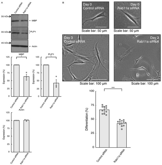 Knockdown of Rab11a affects oligodendroglial cell morphological differentiation. (A) FBD-102b cells were transfected with control (luciferase) or Rab11a siRNA, allowed to differentiate for 3 days, and immunoblotted with the respective antibodies for oligodendroglial differentiation markers (MBP and PLP1) and internal control protein (actin). The respective statistical analyses were depicted in the graph (* p < 0.05; n = 3 blots). (B) Following the induction of differentiation, the respective cell morphologies at 0 and 3 days were placed as the representative images, analyzed, and statistically depicted (*** p < 0.001; n = 10 fields). Cells with secondary branches or cell bodies large enough to accommodate a 25-micrometer circle were considered differentiated ones.
