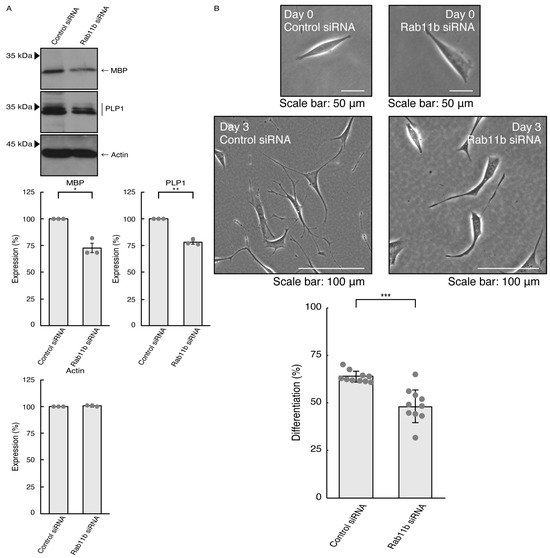 Given that Rab11a as the C9orf72 effector may be involved in the formation of neuronal cell type morphologies, we predicted that Rab11a might also participate in differentiation in oligodendroglial cells. We knocked down Rab11a (see Figure S5) in the FBD-102b cells as the differentiation model of oligodendroglial cells. The knockdown of Rab11a (see Figure S6) decreased the expression levels of oligodendroglial differentiation marker proteins, i.e., myelin basic protein (MBP) and proteolipid protein (PLP1), but not internal control actin protein (Figure 5A). Rab11a knockdown also decreased protrusion complexities in cells (Figure 5B), indicating that Rab11a is positively involved in the regulation of oligodendroglial cell morphological differentiation. Similar results in marker protein expression levels and protrusion complexities were obtained in the case of Rab11b knockdown (Figure 6A,B). Despite the unidentified role of Rab11b downstream of C9orf72, both Rab11a and Rab11b positively regulate oligodendroglial cell morphological differentiation. Taken together, our results suggest that Rab11a, which acts downstream of C9orf72, is more specialized in neuronal cell morphological differentiation. Furthermore, its knockdown effect is restored by hesperetin.