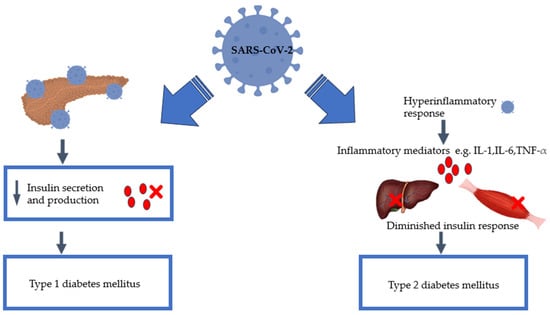 COVID-19 intersects with both type 1 diabetes mellitus and type 2 diabetes mellitus, illustrating the available potential mechanisms that may precipitate an increased risk of the development of new-onset DM for individuals who contracted the SARS-CoV-2 virus [,,,,,].