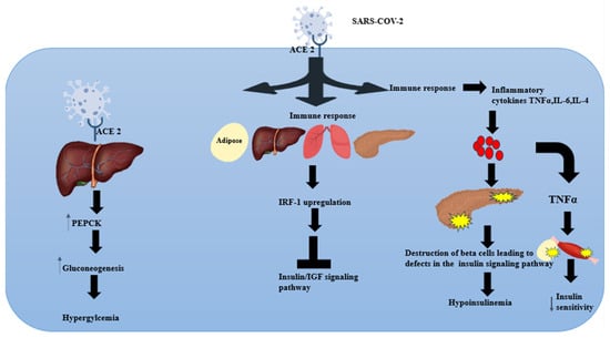 In pre-diabetic individuals, Sestak et al. highlighted a potential mechanism by which viral inflammation can lead to T2DM in a pre-diabetic mouse model []. By exposing the pre-diabetic mice to different viral pathogens, the researchers reported that viral infections independently pose a risk for the onset of T2DM in pre-diabetic obese mice. Viral-induced interferon-γ has been recognised as the culprit in the emergence of insulin resistance in the skeletal muscle, especially in the context of obesity. Given the important role of skeletal muscles in maintaining normoglycemia and the widespread occurrence of insulin resistance in individuals with obesity, it becomes prudent to combat these effects in humans []. With this background, we will now consider unpacking plausible mechanistic insights associated with SARS-CoV-2-induced glycaemic abnormalities.