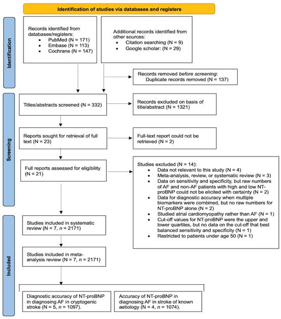 Though several studies have explored the efficacy of these biomarkers in detecting AF post-stroke [13,17,18,19,20,21,22], results have been variable, leaving the true accuracy uncertain. A meta-analysis presents a valuable opportunity to combine these studies, thereby examining diagnostic accuracy comprehensively. Given NT-proBNP’s longer half-life compared to BNP (120 min vs. 20 min) [14,15], coupled with reported higher diagnostic accuracy for AF [16], our study focuses on NT-proBNP.
