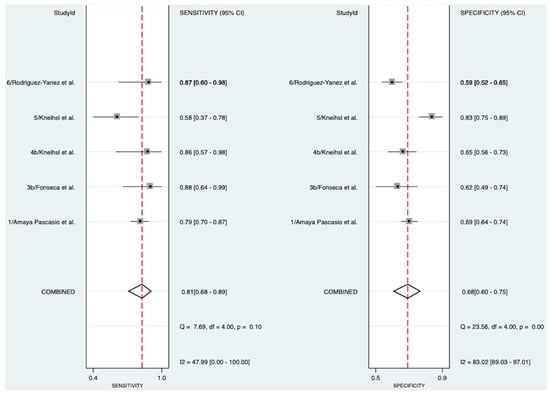 Five studies investigated the diagnostic accuracy of NT-proBNP in detecting AF in patients with cryptogenic stroke [13,17,19,20,21], encompassing 1097 patients (Figure 2). The meta-analysis revealed a good-to-very-good diagnostic accuracy of 80% (AUROC 0.80 [95% CI 0.76–0.83]). NT-proBNP demonstrated a pooled diagnostic sensitivity of 81% (Sensitivity 0.81 [95% CI 0.68–0.89]) and a pooled diagnostic specificity of 68% (Specificity 0.68 [95% CI 0.60–0.75]). The SROC curve can be found in Supplementary Figure S1. Moderate heterogeneity was observed for the test of sensitivity (I2 = 47.99, [95% CI 0.00–100.00]), and substantial-to-considerable heterogeneity for the test of specificity (I2 = 83.02, [95% CI 69.03–97.01]).