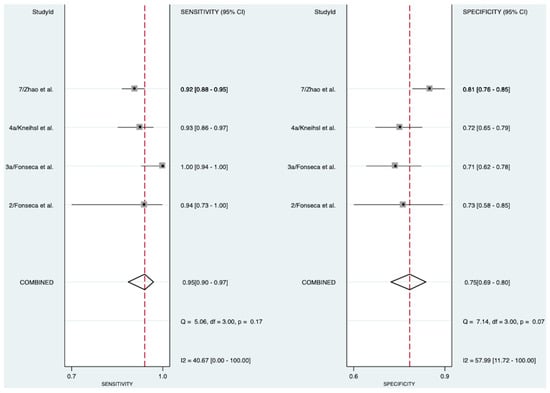 In patients with stroke of known etiology, four studies involving 1074 patients (Figure 3) explored the diagnostic accuracy of NT-proBNP in detecting AF [13,18,19,22]. The meta-analysis indicated an excellent diagnostic accuracy of 91% (AUROC 0.91 [95% CI 0.88–0.93]). NT-proBNP exhibited a pooled diagnostic sensitivity of 95% (Sensitivity 0.95 [95% CI 0.90–0.97]) and a pooled diagnostic specificity of 75% (Specificity 0.75 [95% CI 0.69–0.80]). The SROC curve, likelihood ratio matrix, and goodness of fit plots can be found in Supplementary Figures S1, S2, and S3, respectively. Moderate heterogeneity was observed for the test of sensitivity (I2 = 40.67, [95% CI 0.00–100.00]), and moderate-to-substantial heterogeneity for the test of specificity (I2 = 57.99, [95% CI 11.72–100.00]).