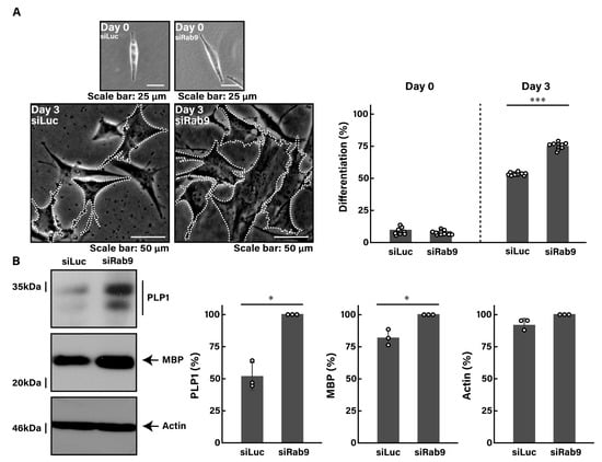 Knockdown of Rab9 promotes cell morphological changes. (A) FBD-102b cells were transfected with control luciferase siRNA (siLuc) or Rab9 siRNA (siRab9). Following the induction of differentiation, cell morphologies were photographed and cells with differentiated oligodendroglial cell-like widespread membranes were statistically depicted at day 0 or 3 (*** p < 0.001; n = 10 fields). Typical cell morphologies with differentiated oligodendroglial cell-like widespread membranes were surrounded by white dotted lines. (B) Cell lysates at day 3 following the induction of differentiation were immunoblotted with the respective antibodies against PLP1, MBP, and internal control actin and statistically depicted as a percentage comparison (* p < 0.05; n = 3 blots).
