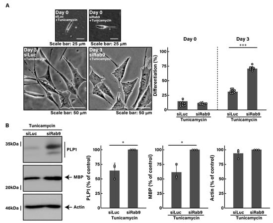 Knockdown of Rab9 recovers phenotypes induced by tunicamycin. (A) FBD-102b cells were transfected with luciferase siRNA (siLuc) or Rab9 siRNA (siRab9). Following the induction of differentiation in the presence of 100 ng/mL of tunicamycin, cell morphologies were photographed and cells with differentiated oligodendroglial cell-like widespread membranes were statistically depicted at day 0 or 3 (*** p < 0.001; n = 10 fields). Typical cell morphologies with differentiated oligodendroglial cell-like widespread membranes were surrounded by white dotted lines. (B) Cell lysates at day 3 were immunoblotted with the respective antibodies against PLP1, MBP, and actin and statistically depicted as a percentage comparison (* p < 0.05; n = 3 blots).