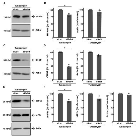 Next, we investigated whether Rab9 knockdown has the ability to recover tunicamycin-induced decreases in morphological differentiation. The knockdown of Rab9 recovered phenotypes with widespread membranes by approximately 50 to 60% (Figure 2A), consistent with increased expression levels of PLP1 and MBP (Figure 2B). In contrast, the expression levels of actin were comparable between control- and Rab9-knocked down cells. In addition, Rab9 knockdown recovered the expression levels of both HSPA5 (Figure 3A,B) and CHOP (Figure 3C,D), as well as the phosphorylation levels of eIF2a (Figure 3E,F), illustrating that Rab9 knockdown has protective effects against tunicamycin-induced phenotypes.