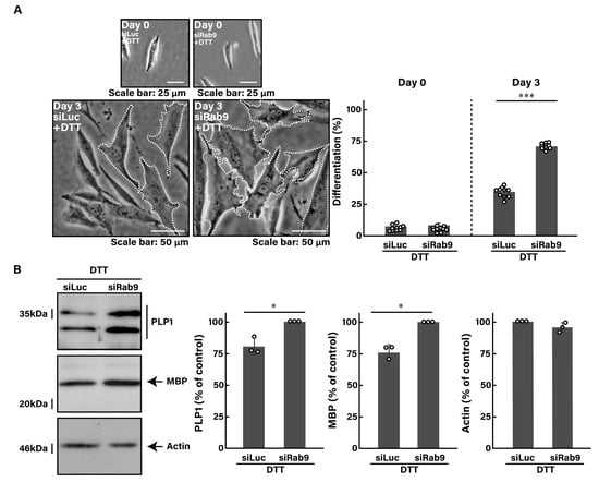 Knockdown of Rab9 recovers phenotypes induced by DTT. (A) FBD-102b cells were transfected with luciferase siRNA (siLuc) or Rab9 siRNA (siRab9). Following the induction of differentiation in the presence of 1 mM DTT, cell morphologies were photographed and cells with differentiated oligodendroglial cell-like widespread membranes were statistically depicted at day 0 or 3 (*** p < 0.001; n = 10 fields). Typical cell morphologies with differentiated oligodendroglial cell-like widespread membranes were surrounded by white dotted lines. (B) Cell lysates at day 3 were immunoblotted with the respective antibodies against PLP1, MBP, and actin and statistically depicted as a percentage comparison (* p < 0.05; n = 3 blots).