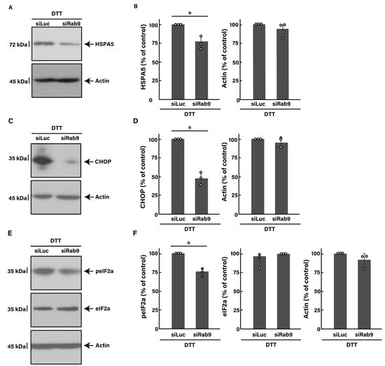 We investigated whether Rab9 knockdown can recover cellular phenotypes induced by ER stress under another pharmacological stress condition. We thus examined whether treatment with dithiothreitol (DTT), another inducer of stress signaling and UPR in the ER [,,], stimulates ER stress signaling. Indeed, treatment with DTT increased the expression levels of both HSPA5 and CHOP, along with the phosphorylation levels of eIF2a, while decreasing the expression levels of MBP marker proteins (Figure S3).