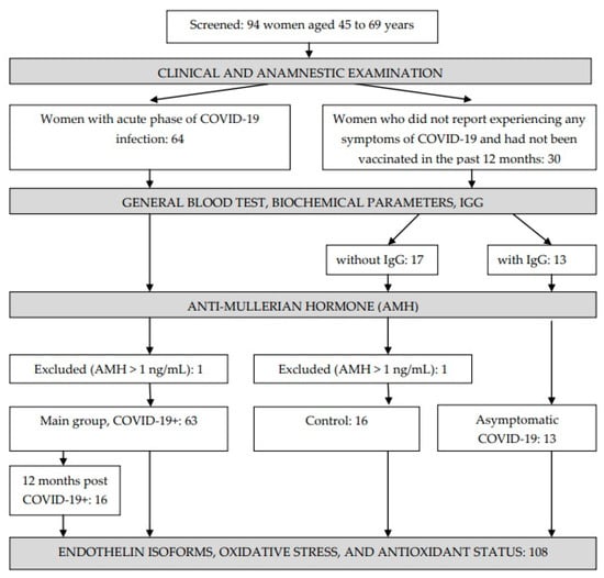 The study included 94 women aged 45 to 69 years (Figure 1). Of these, 64 women were selected for inclusion in the main cohort (COVID-19+); these women were hospitalized in the Irkutsk Regional Infectious Clinical Hospital during the period from June 2020 to March 2021, had a laboratory-confirmed PCR test for the presence of the SARS-CoV-2, and displayed moderate COVID-19 symptoms accompanied by pneumonia. Upon the patients’ admission to the hospital, questionnaires, an analysis of medical records, a general clinical examination, and computed tomography were performed. One woman with an anti-Mullerian hormone (AMH) level of 5.18 ng/mL was excluded from the main group. The distribution of patients by the degree of lung damage according to the results of computed tomography was as follows: CT-1 (54%), CT-2 (33.3%), CT-3 (12.7%). Among those who survived COVID-19, 16 women who were called for a clinical and anamnestic examination agreed to be examined again after 12 months.