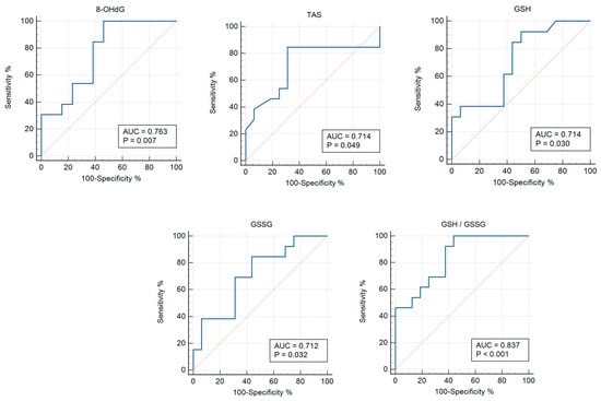 When comparing the groups with COVID-19+ and asymptomatic COVID-19, the significance of the parameters was identified for TBARs (AUC 0.687; p = 0.051), AGEs (AUC 0.735; p = 0.0004), 8-OHdG (AUC 0.648; p = 0.050), TAS (AUC 0.709; p = 0.020), SOD (AUC 0.760; p < 0.0001), GSH/GSSG (AUC 0.658; p = 0.039), GPx (AUC 0.774; p < 0.0001), GSTpi (AUC 0.864; p < 0.001), and GR (AUC 0.871; p < 0.0001) (Table 5, Figure 4).