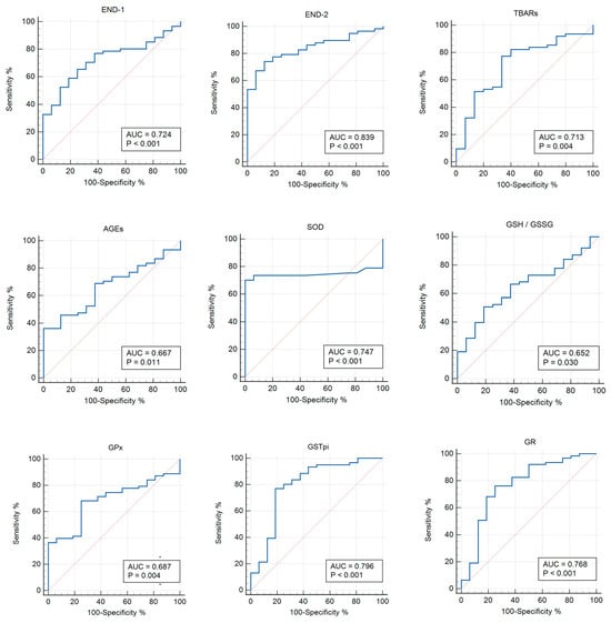 The ROC analysis shows the diagnostic significance of 8-OHdG (AUC 0.763; p = 0.006), TAS (AUC 0.714; p = 0.048), GSH (AUC 0.714; p = 0.030), GSSG (AUC 0.712; p = 0.031), and GSH/GSSG (AUC 0.837; p < 0.0001) for the group with asymptomatic COVID-19 versus the control group (Table 3; Figure 2). In addition, the significance of the parameters was identified for END-1, END-2, TBARs (AUC 0.713; p = 0.004), AGEs (AUC 0.667; p = 0.011), SOD (AUC 0.747; p < 0.001), GSH/GSSG (AUC 0.652; p = 0.030), GPx (AUC 0.687; p = 0.004), GSTpi (AUC 0.796; p < 0.001), and GR (AUC 0.768; p < 0.001) for the group with COVID-19+ versus the control (Table 4, Figure 3).