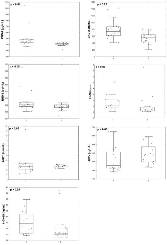 Endothelin isoforms and oxidative stress parameters in menopausal women with COVID-19 (group 1, n = 16) and 12 months after infection with COVID-19 (group 2, n = 16).