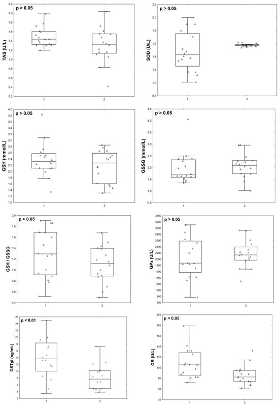 GR and GP activities were assayed using commercial kits (Randox Laboratories Ltd., Crumlin, UK; GR2368, RS504; BioChemMack distributor) on an automatic photometer (BTS-330, BioSystems, Barcelona, Spain). GR catalyzes the reduction of GSH in the presence of NADPH, which is oxidized to NADP+. Using cumene hydroperoxide, GP catalyzes the oxidation of glutathione, which is then immediately reduced with the oxidation of NADPH to NADP+ in the presence of GR and NADPH. The results were calculated according to the manufacturer’s recommendations. The enzyme concentration required to catalyze the conversion of 1.0 μmol of substrate per min at 37 °C was taken as the unit of enzyme activity. Absorbance changes were measured at λ = 340 nm for GR at intervals of 1 min for 5 min and for GP, at intervals of 1 min for 3 min. Enzyme activity is expressed in units per 1 L of serum (for GR) or hemolysate (for GP) (U/L).