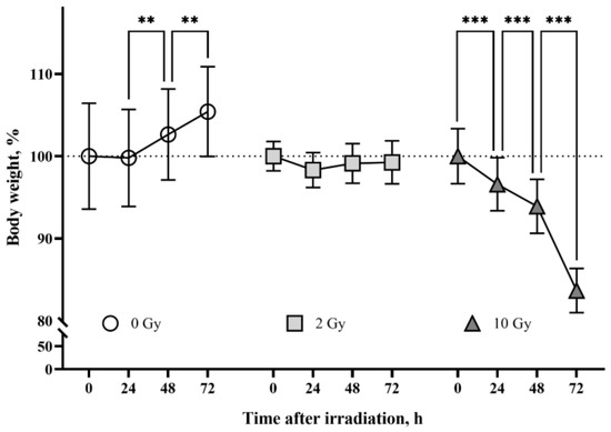 Figure 1. The effects of ionizing radiation (IR) on body weight in rats. The group of sham-irradiated rats had an increase in mean body weight (n = 8). IR 2 Gy caused arrest of body weight gain in animals (n = 8). The group of rats irradiated at the dose of 10 Gy had a daily decrease in body weight (n = 8). Data are presented as a percentage of the average weight of the groups at the beginning of the tests. Two-way ANOVA followed by Tukey’s multiple comparisons test, ** p < 0.01, *** p < 0.001.