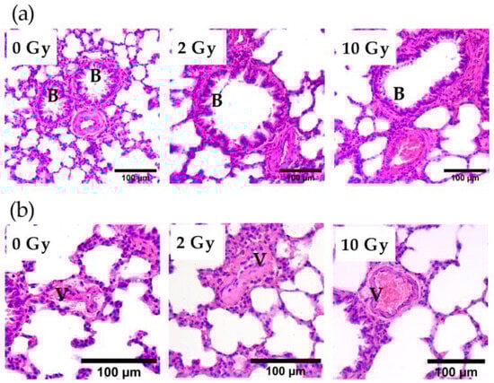 Figure 3. Bronchioles (a) and vessels (b) in the lung tissue of rats irradiated at doses of 0, 2, and 10 Gy. The 10 Gy IR caused lung vessel congestion (b). Staining with H&E. V—vessel; B—bronchiole.