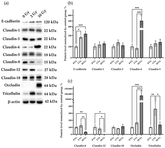 Figure 4. E-cadherin, claudin-1, -3, -4, -5 -8, -12, -18, occludin, and tricellulin in rat lungs 72 h after IR at doses of 0, 2, and 10 Gy. (a) Representative blots. Full images of the Western blot are in the Supplementary Material (Figures S2–S12). (b,c) Western blot analysis of the intercellular junction proteins levels. The intensity of bends was normalized to the intensity of β-actin bends in the corresponding samples. One-way ANOVA followed by Tukey’s multiple comparisons test, * p < 0.05, ** p < 0.01, *** p < 0.001; n = 7–8.