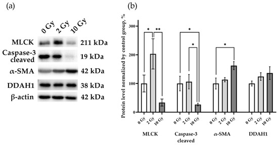 Figure 5. MLCK, cleaved caspase-3, α-SMA, and DDAH1 in rat lungs 72 h after IR at doses of 0, 2, and 10 Gy. (a) Representative blots. Full images of the Western blot are in the Supplementary Material (Figures S13–S16). (b) Western blot analysis of MLCK, cleaved caspase-3, α-SMA, and DDAH1. The intensity of bends was normalized to the intensity of β-actin bends in the corresponding samples. One-way ANOVA followed by Tukey’s multiple comparisons test, * p < 0.05, ** p < 0.01; n = 7–8.