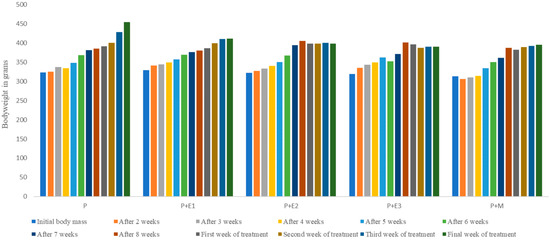 As shown in Table 1, the basal values of glycemia were statistically significantly different between the examined groups in relation to the P group (p < 0.01). The glycemia values at 30 min were also statistically significantly different in relation to the P group (p < 0.01). At 30 min, a statistically significantly lower value of glycemia was shown in the P+E3 group compared to P+E1, P+E2, and P+M groups (at p < 0.05). The measured glycemia values of the examined P+E1, P+E2, P+E3, and P+M groups at 60 min were statistically significantly different compared to the P group (p < 0.01). In addition, a statistically significantly lower value of glycemia was shown in the P+E3 group compared to the P+E1 group (p < 0.05). After 120 min, a statistically significant difference in the glycemia of the examined P+E1, P+E2, P+E3, and P+M groups was shown compared to the P group (p < 0.01).