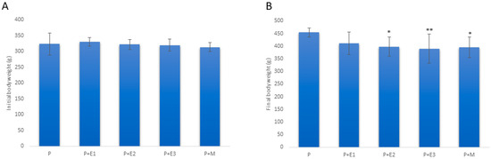 Body weight changes before (A) and after (B) EMPA and MET treatments. * statistical significance at level p < 0.05 compared to the P group; ** statistical significance at level p < 0.01 compared to the P group.
