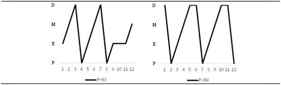 Changes in the estrus cycle in five rats induced with PCOS and after the applied treatments. Y-axis legend: D—diestrus, M—metaestrus, E—estrus, and P—proestrus.