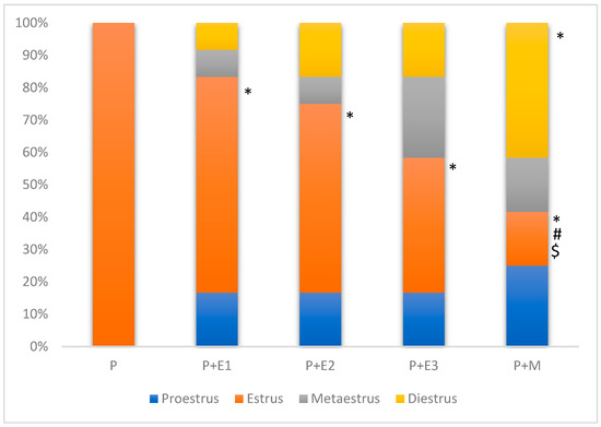 The proportions of different estrus cycle stages in the three groups were analyzed using the Chi-square test, and the differences were evaluated by z-test. * statistically significant difference compared to the P group (p < 0.05), # statistically significant difference compared to the P+E1 group (p < 0.05), and $ statistically significant difference compared to the P+E2 group (p < 0.05).