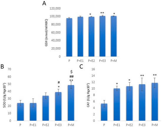 The levels of anti-oxidative enzymes in different groups. (A) levels of GSH; (B) levels of CAT; and (C) levels of SOD. Bars represent the means ± SEM. * statistical significance at level p < 0.05 compared to the P group; ** statistical significance at level p < 0.01 compared to the P group; # statistical significance at level p < 0.05 compared to the P+E1 group; ## statistical significance at level p < 0.01 compared to the P+E1 group; and $ statistical significance at level p < 0.05 compared to the P+E2 group.