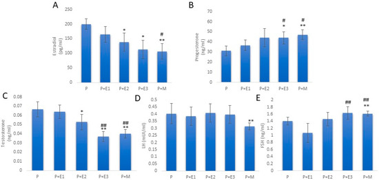 The levels of sex hormones in different groups. (A) estradiol levels; (B) progesterone levels; (C) Testosterone levels; (D) FSH levels; and (E) LH levels.Bars represent the means ± SEM. * statistical significance at level p < 0.05 compared to the P group; ** statistical significance at level p < 0.01 compared to the P group; # statistical significance at level p < 0.05 compared to the P+E1 group; and ## statistical significance at level p < 0.01 compared to the P+E1 group.