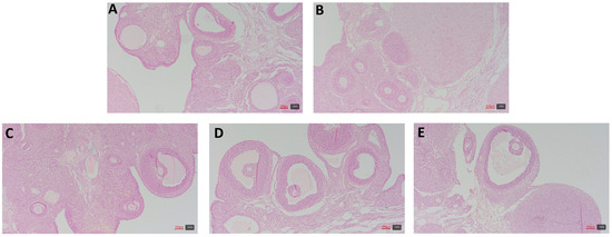Representative views of the ovaries of the examined groups. (A) the P group; (B) the P+E1 group; (C) the P+E2 group; (D) the P+E3 group; and (E) the P+M group.