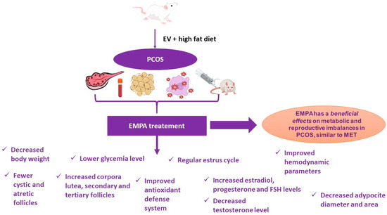 Summary scheme of the effects of EMPA in a PCOS rat model. PCOS—polycystic ovary syndrome; EMPA—empagliflozin; and MET—metformin.