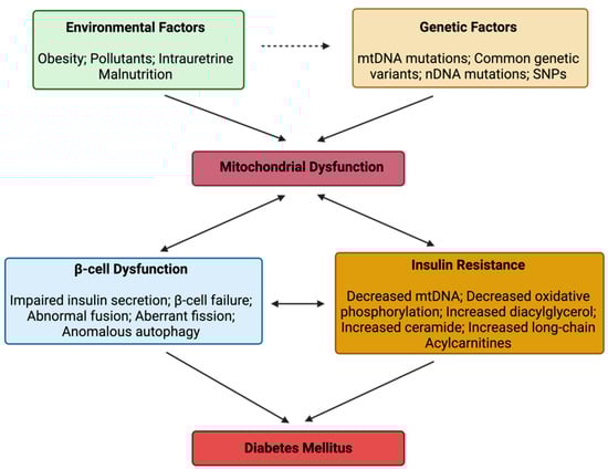 Mitochondrial dysfunction plays a significant role in the pathogenesis of DM, contributing to IR, impaired glucose metabolism, and oxidative stress. It may arise due to genetic or environmental factors not limited to mutations, obesity and environmental pollutants, which propagate β-cell dysfunction and IR to drive DM onset and the downstream effect (Figure 1).