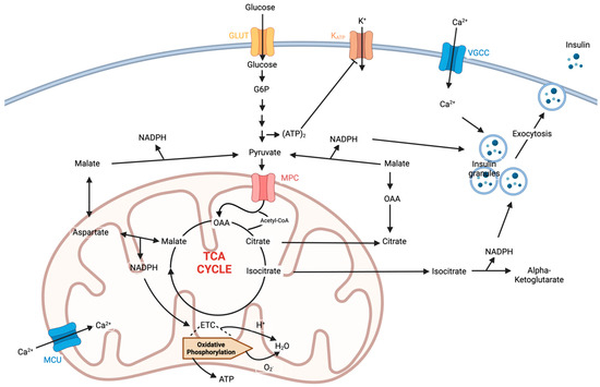 Mitochondrial pathways impacting insulin secretion and possible action. Abbreviations: TCA, tricarboxylic acid; OAA, oxaloacetate, ETC, electron transport chain; MCU, mitochondrial calcium uniporter; VGCC, voltage-gated calcium channels; GLUT, glucose transporters; MPC, mitochondrial pyruvate carrier.