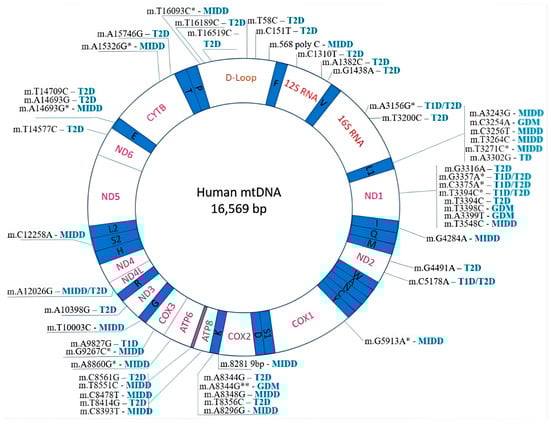Map of mtDNA mutations associated with diabetes mellitus [23]. *: Newly discovered mutations; **: Also associated with a maternally inherited multisystem mitochondrial disorder known as myoclonic epilepsy with ragged red fibres (MERRF).