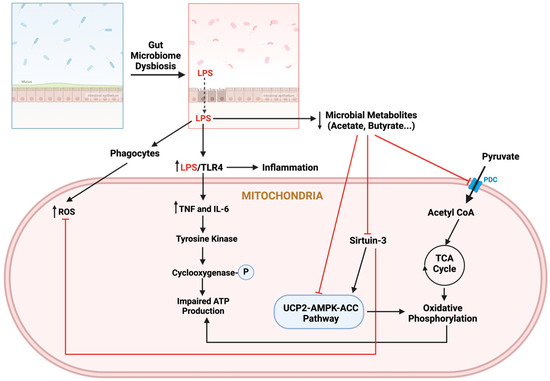 Microbiota–mitochondria interplay. Abbreviations: AMPK, AMP-activated protein kinase; COX, cyclooxygenase; LPS, lipopolysaccharide; ROS, reactive oxygen species; PDC, pyruvate dehydrogenase complex; ACC, acetyl-CoA carboxylase; UCP-2, uncoupling protein 2.