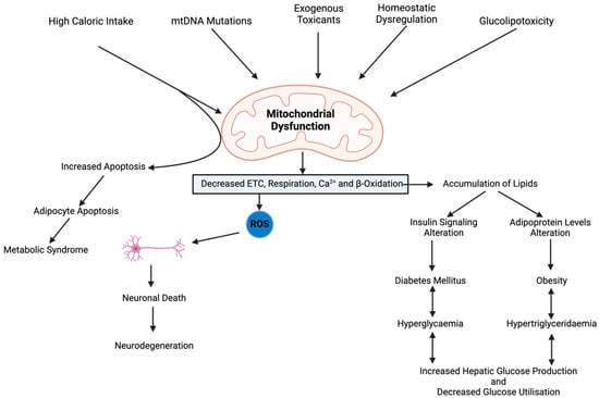 Mitochondria are dynamic organelles involved in cellular energy production, the regulation of apoptosis, and various metabolic pathways, especially in insulin-sensitive tissues such as the skeletal muscle, the liver, and the adipose tissue. IR dysregulates glucose uptake and mitochondrial function and vice-versa, where oxidative phosphorylation (OXPHOS) and ATP production are the mechanisms through which MD contributes to IR, as shown in Figure 2 [14]. Reduced ATP synthesis impairs insulin signalling and phosphatidylinositol-3-kinase/Akt pathways, leading to decreased glucose uptake and glycogen synthesis, dysregulated fatty acid metabolism, and the accumulation of lipid intermediates, which further exacerbate IR by interfering with insulin signalling cascades and glucose metabolic pathways, further exacerbating hyperglycaemia [1,4]. MD leads to the accumulation of ROS, which activates stress kinases and inflammatory pathways, contributing to IR. Impaired mitochondrial biogenesis and dynamics also play a role in IR, as dysfunctional mitochondria fail to adapt to changing metabolic demands, leading to cellular dysfunction and IR [15].