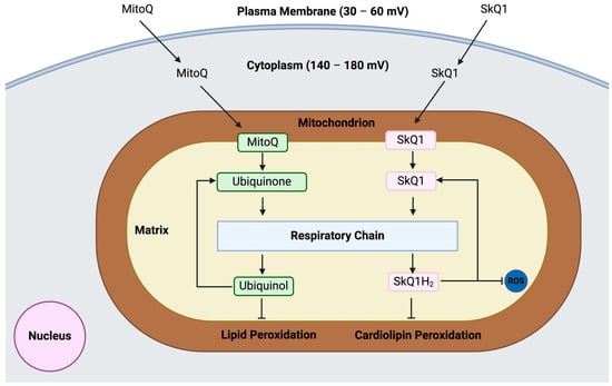 Antiperoxidation and radical scavenging mechanism of 10-(4,5-dimethoxy-2-methyl-3,6-dioxo-1,4-cyclohexadien-1-yl)decyl) triphenylphosphonium mesylate (MitoQ) and 10-(6′-plastoquinonyl) decyltriphenylphosphonium (SkQ1) in the mitochondria.
