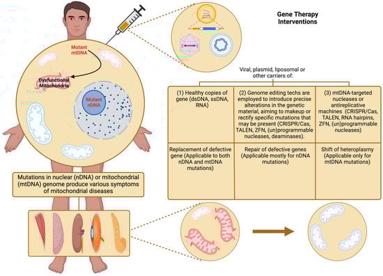 DM-associated mtDNA mutation treatments are currently insufficient, as they only alleviate symptoms without addressing the root cause or offering a cure [120]. Gene therapies hold significant promise for treating MD in DM as they aim to restore mitochondrial function, enhance cellular bioenergetics, and alleviate metabolic abnormalities through targeted manipulation of gene expression and mtDNA integrity [121]. Mitochondrial gene therapy, including allotopic expression and mitochondrial gene editing, offers potential strategies for correcting mtDNA mutations and restoring mitochondrial function, tackling the problem at its root [122,123]. Allotopic expression involves nuclear translocation of mitochondrial genes, bypassing mtDNA mutations and restoring protein synthesis within mitochondria. Mitochondrial gene editing technologies, such as CRISPR-Cas9, enable precise modification of mtDNA sequences, offering potential therapeutic benefits for inherited mitochondrial diseases and metabolic disorders [124]. CRISPR-based approaches hold promise for correcting mtDNA mutations associated with DM and restoring mitochondrial function in affected individuals [125]. These therapeutic approaches centre on introducing genetic material into the mitochondria to inhibit, modify, or enhance the function of malfunctioning genes (Figure 8). To facilitate the direct delivery of target genes into the mitochondria, vectors designed with high targeting specificity are loaded with genetic material [126]. These vectors are engineered to transport, shield, and guide the genetic content to the mitochondria, ensuring its effective release and promoting the expression of mitochondrial genes and their corresponding proteins [127]. Viral vectors, including retroviruses, adenoviruses, and lentiviruses, are extensively utilised in gene delivery due to their effectiveness in cell transfection [128]. Adeno-associated viruses (AAVs) are preferred in preclinical applications because of their substantial loading capacity, biocompatibility, low immunogenicity, and minimal immune response. Additionally, gene release research has frequently employed non-viral delivery systems that utilise cell-penetrating peptides, micelles, polymers, and lipids [129]. Moreover, ternary non-viral systems that combine polymers and/or peptides have demonstrated considerable efficacy in enhancing payload encapsulation, thus improving gene delivery and expression [130].