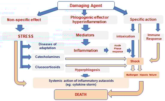 As long as the dynamics of inflammation is not triggered in those organs and tissues, where there is no primary local damage, the organism manages to prevent the immersion of a large mass of cells in the state of hypoxic or free-radical necrobiosis. But if the systemic–local protective equilibrium is replaced by absolute prevalence of regulators of short-distance action (cytokine storm) or, on the contrary, of systemic regulatory stereotypes (centralization of blood circulation), then the cells of the organs that have fallen into hypoxia, although there were no primary damages, themselves become sources of an increasing number of inflammatory mediators. The production of inflammatory mediators is inevitable in the process of cell degeneration and death. The significant excess of these mediators in the systemic circulation disturbs blood rheological properties, makes the endothelium sticky, shifts the balance of hemostasis and anti-hemostasis to the thrombogenic side, affects the central regulation of respiration and cardiac activity, and contributes to acidosis. Finally, hemodynamic shock is formed: multiorgan hypoxic failure results from decreased venous return and their impaired perfusion [,].