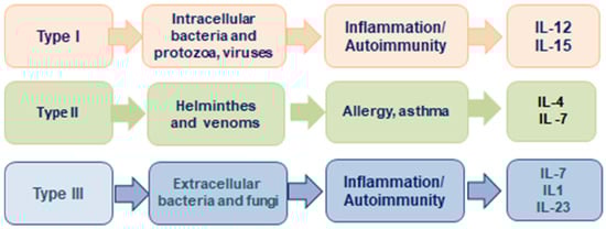 The concept of the three cell-mediated effector functions was introduced by F. Annunziato et al. in 2015 []. This publication presents a new concept about effector T cells and innate lymphoid cells (ILCs) that characterize the innate and adaptive immune systems, which he proposed to classify as type 1, type 2, and type 3 (Figure 3). Type 1 immunity consists of T-bet(+) IFN-γ-producing group 1 BMPs (ILC1 and natural killer cells), CD8(+) cytotoxic T cells (TC1), and CD4(+) TH1 cells, which protect against intracellular microbes by activating mononuclear phagocytes. Type 2 immunity consists of GATA-3(+) ILC2s, TC2 cells, and TH2 cells producing IL-4, IL-5, and IL-13, which cause activation of mast cells, basophils, and eosinophils, and production of IgE antibodies, thus protecting against helminths and poisons. Type 3 immunity is mediated by retinoic acid-related orphan receptor γt(+) ILC3s; TC17 cells; and TH17 cells producing IL-17, IL-22, or both receptors, which activate mononuclear phagocytes, as well as attract neutrophils and elicit epithelial antimicrobial responses, thus protecting against extracellular bacteria and fungi. On the other hand, type 1 and type 3 immunity mediate autoimmune diseases, while type 2 reactions can cause allergic diseases.