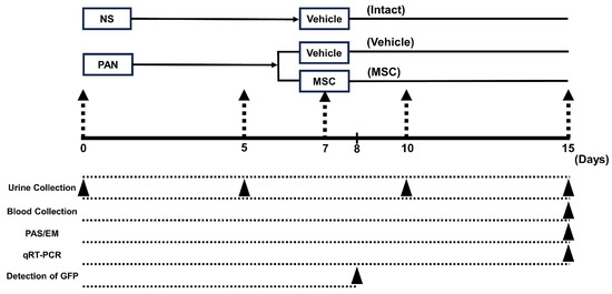 Experimental protocol. PAN or NS was injected subcutaneously on day 0. On day 5, PAN-injected rats received an intravenous infusion of vehicle or MSCs on day 7. Urine was collected before PAN or NS injection, and on days 5, 10, and 15 after PAN or NS injection. Blood and tissue were collected for histological analyses, and RT-PCR analyses were conducted on day 15. Tissue for detection of GFP was collected on day 8. NS, normal saline; MSC, mesenchymal stem cell; PAN, puromycin aminonucleoside; qRT-PCR, quantitative reverse-transcription PCR.