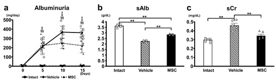Urine and blood analysis. (a) Urine albumin was measured before PAN or NS injection and on days 5, 10, and 15 after PAN or NS injection. MSC vs. Vehicle: * p < 0.05, Intact vs. Vehicle ‡ p < 0.01, Intact vs. MSC §§ p < 0.01. (b) Serum albumin (sAlb), (c) serum creatinine (sCr). sAlb and sCr were measured on day 15. ** p < 0.01, n = 6 for each group. Error bars indicate SEM. Closed marks (■, ●, ▲) indicate average values, and open marks (□, ◯, △) indicate individual values.
