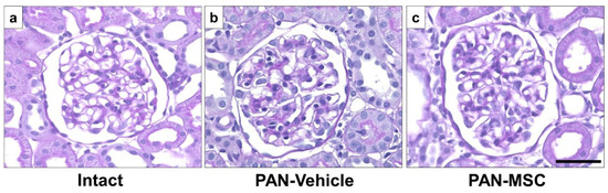 Light microscopic analysis with PAS staining. (a) Intact, (b) PAN-Vehicle, and (c) PAN-MSC groups. Scale bar = 50 μm. MSC, mesenchymal stem cell; PAN, puromycin aminonucleoside.