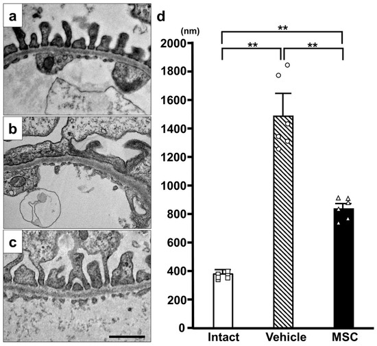 Electron microscopic analysis. Representative electron microscopy images of (a) Intact, (b) PAN-Vehicle, and (c) PAN-MSC groups. (d) Quantification of podocyte foot width. Scale bar = 1 μm. ** p < 0.01, n = 6 for each group. Error bars indicate SEM. Open marks (☐, ◯, △) indicate individual values.