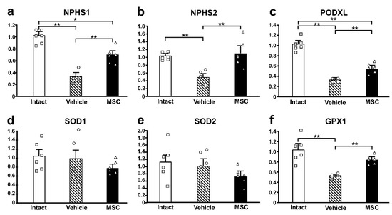 Gene expression of podocyte-associated and oxidative stress-related genes. Relative mRNA expression levels of (a) NPHS1, (b) NPHS2, (c) PODXL, (d) SOD1, (e) SOD2, and (f) GPX1. * p < 0.05, ** p < 0.01, n = 6 for each group. Error bars indicate SEM. Open marks (☐, ◯, △) indicate individual values.