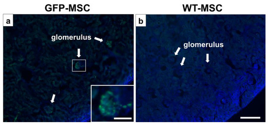 Distribution of GFP-MSCs in vivo. The intravenously infused GFP-MSCs (green) were observed in the DAPI (blue)-counterstained glomerulus (a) 1 day after GFP-MSC administration. (b) No GFP-positive signals in the non-GFP-MSC (WT-MSC)-infused MCD rats. Scale bar = 300 μm (a,b) and 100 μm (inset in a). DAPI, diamidino-2-phenylindole; GFP, green fluorescent protein; MCD, minimal change disease; MSC, mesenchymal stem cell; WT, wild type.