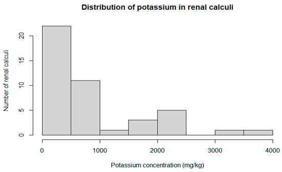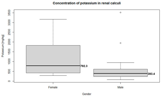 Potassium was the only trace metal differentiating the male and female groups; all other elements were not significantly different between the groups. Detailed characteristics of the potassium distribution in the renal calculi are presented in Figure 1 and Figure 2. The concentration of potassium in the renal calculi was significantly different (p = 0.007) between the female (792.3 mg/kg, 95% CI = 297.12–749.30) and male (393.4 mg/kg, 95% CI = 109.82–2773.05) groups. Kendal’s rank correlation coefficient was calculated to assess the correlation between the potassium concentration in the renal calculi and the patient’s age. The natural diminishment of renal function related to aging may also influence the concentration of trace elements. However, the results of the test show no monotonic relationship between the patients’ age and potassium concentration (Kendal’s Tau τ = −0.09; p-value = 0.392).