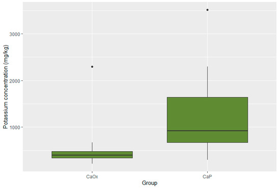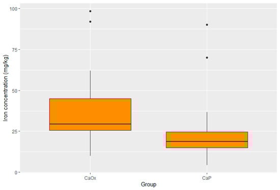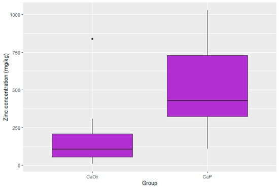 Statistically significant differences were present in the concentration of four elements. The concentrations of zinc, potassium, and lead were substantially lower in the CaOx Group than in the CaP Group (p < 0.001 for Zn; p < 0.001 for K; p = 0.017 for Pb). Moreover, the iron concentration was significantly higher in the CaOx Group (p = 0.003). A graphic presentation of the results is provided through box plots in Figure 3, Figure 4, Figure 5 and Figure 6.