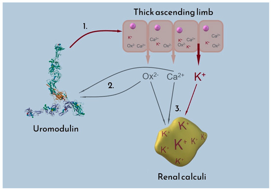 As mentioned in the previous paragraph, the difference in the potassium content of studied calculi cannot be easily tied to increased potassium intake, as reflected in the potassium blood levels. The higher prevalence of urine uromodulin in women provides an explanation both for the morbidity of urolithiasis and the sex-dependent difference in potassium concentration in renal calculi. The presence of uromodulin in urine has an inhibitory influence on renal calculi formation, lowering the morbidity of urolithiasis in women. Simultaneously, uromodulin promotes the excretion of potassium—consequently, due to the absorption of calcium ions, this is reflected by a higher concentration of potassium in the renal calculi. The suggested influence of uromodulin on calcium oxalate stone potassium excretion is depicted in Figure 7.